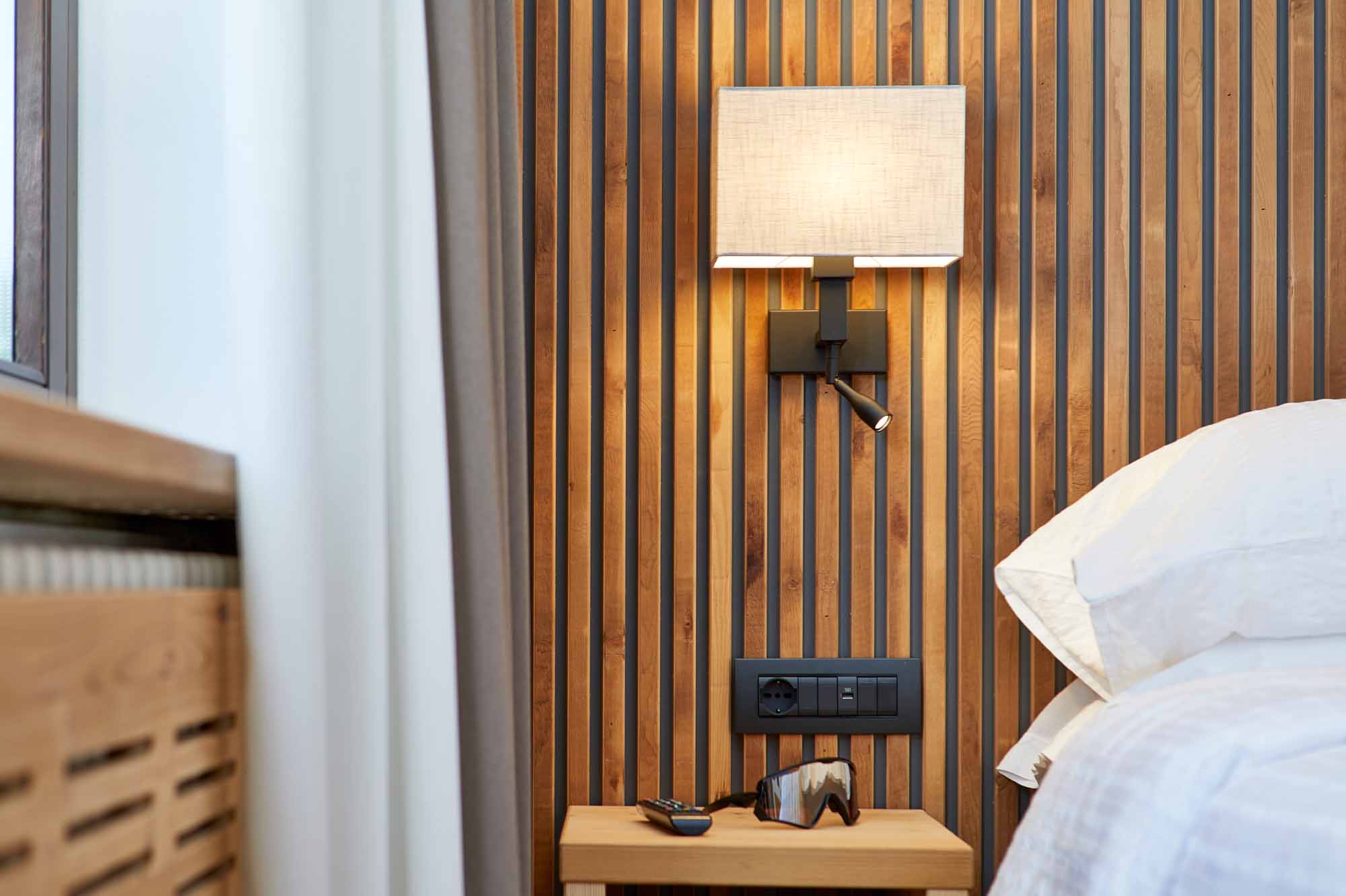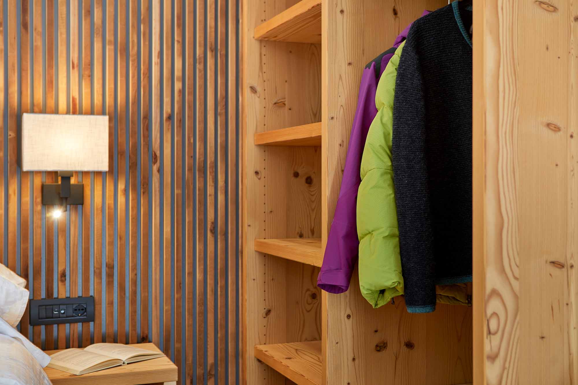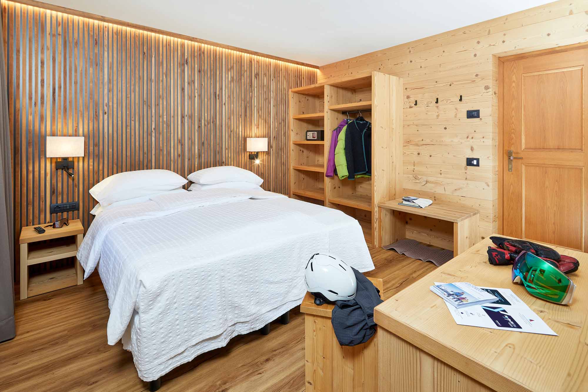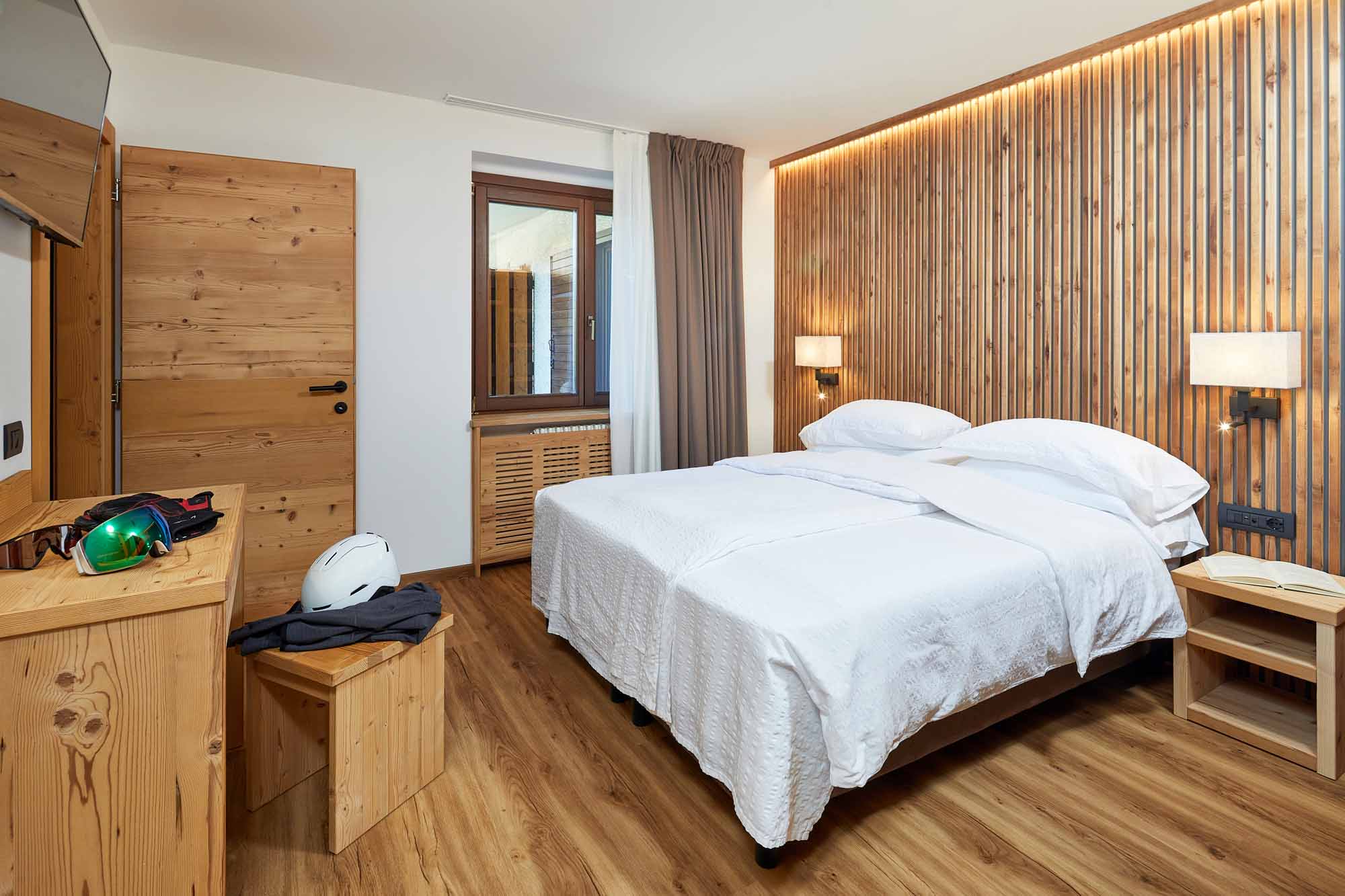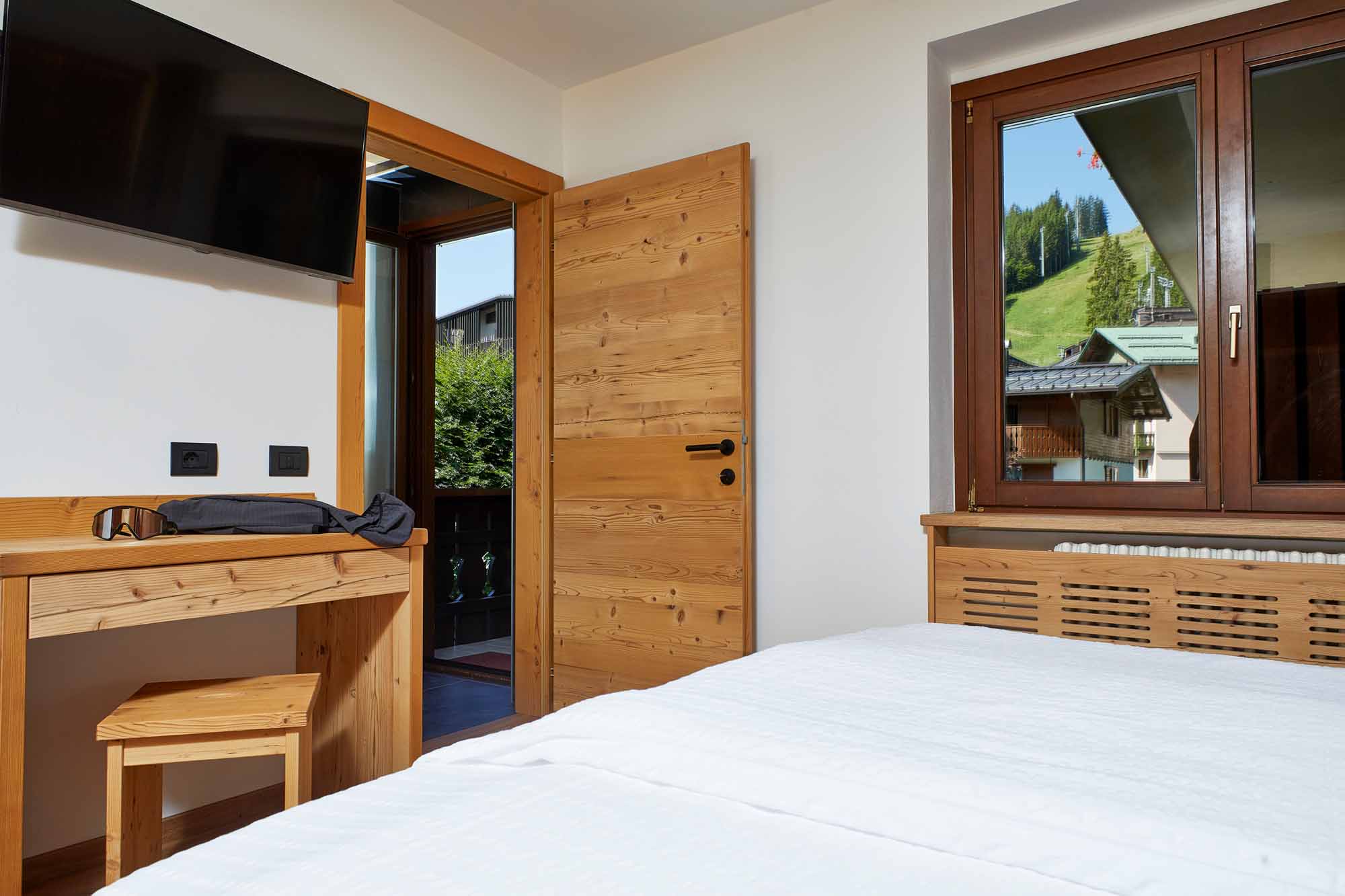 Arredo in legno di abete spazzolato con tinte naturali e in legno di cirmolo. Letto matrimoniale o 2 letti singoli. Bagno con doccia e set di cortesia. Un piccolo balcone si affaccia dalla porta finestra del bagno.