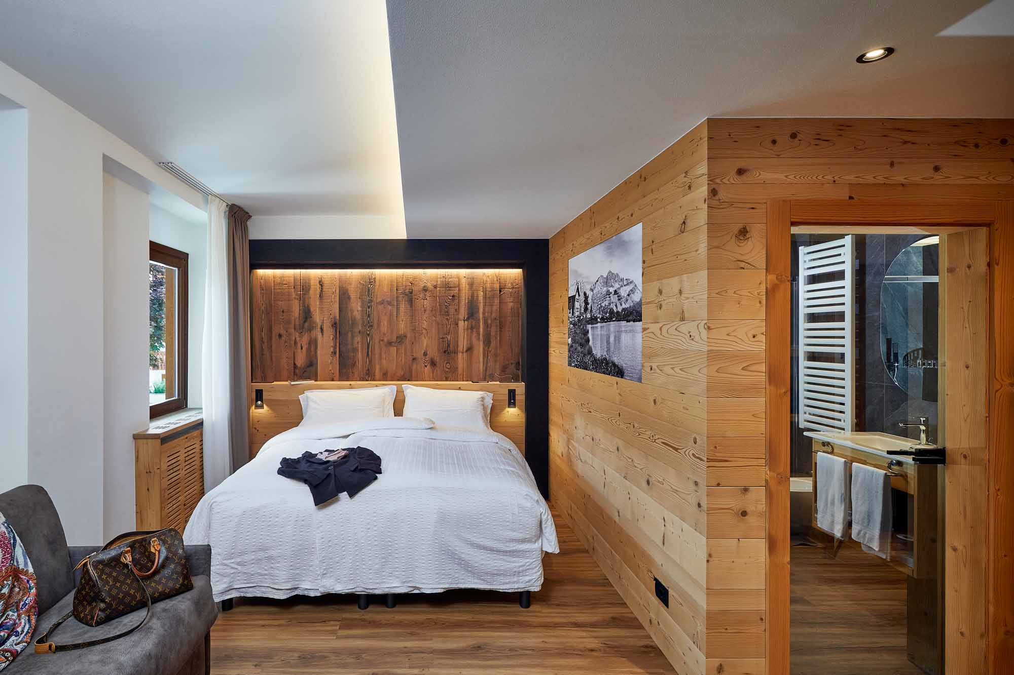 Camera di circa 22 mq con pavimento in legno. Arredo in legno di abete spazzolato con tinte naturali. Letto matrimoniale king size o 2 letti singoli. La camera dispone di una poltrona che può trasformarsi in letto. Culla disponibile su richiesta. Bagno con doccia e set di cortesia.