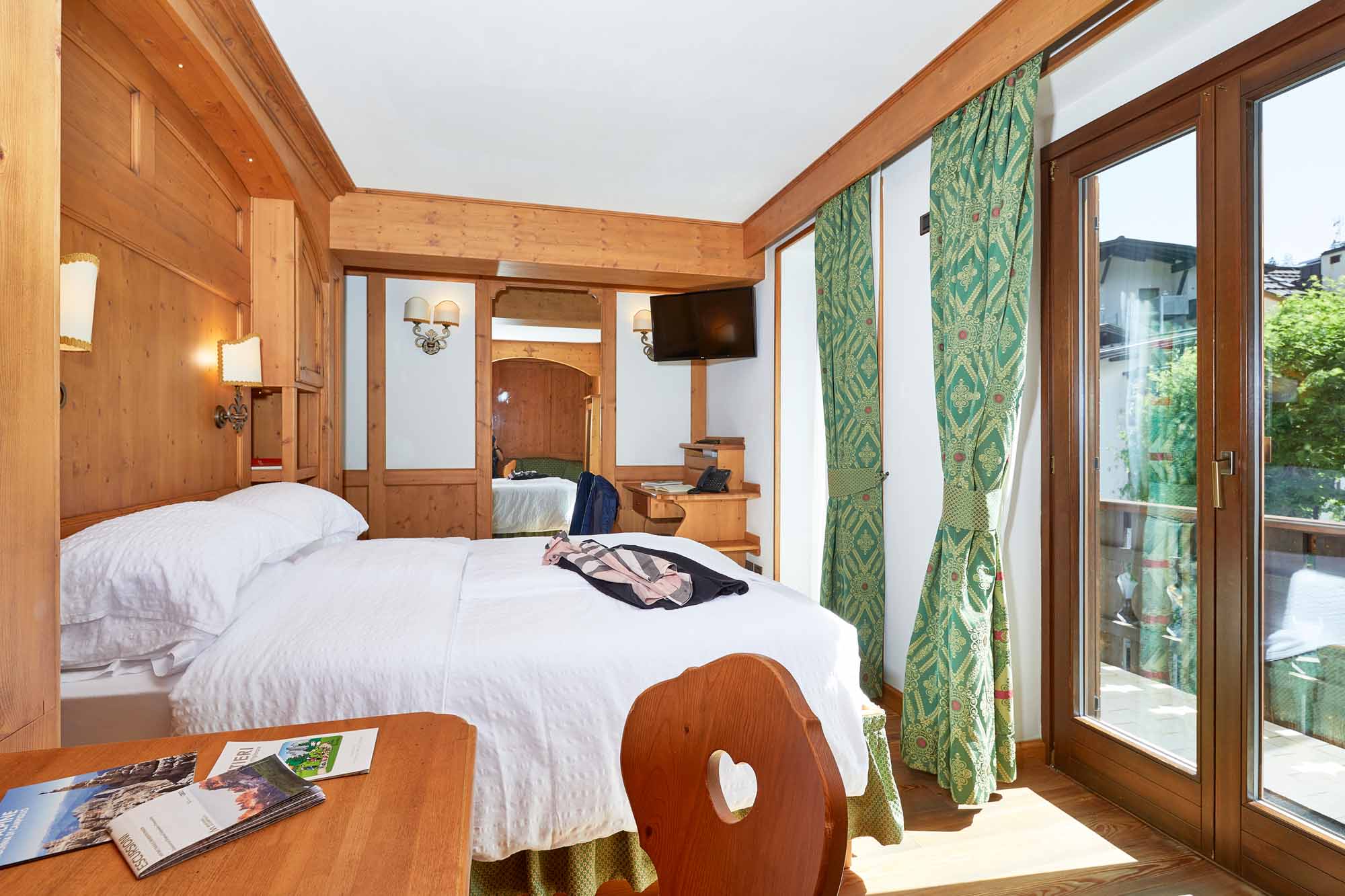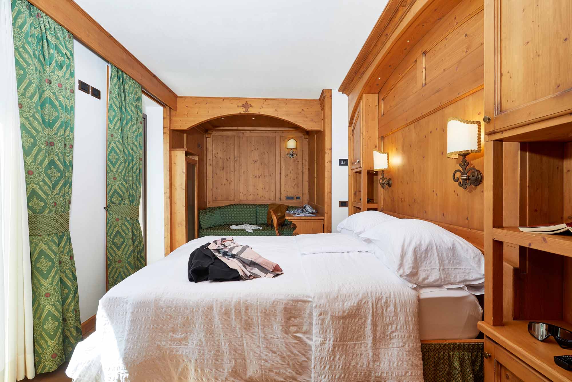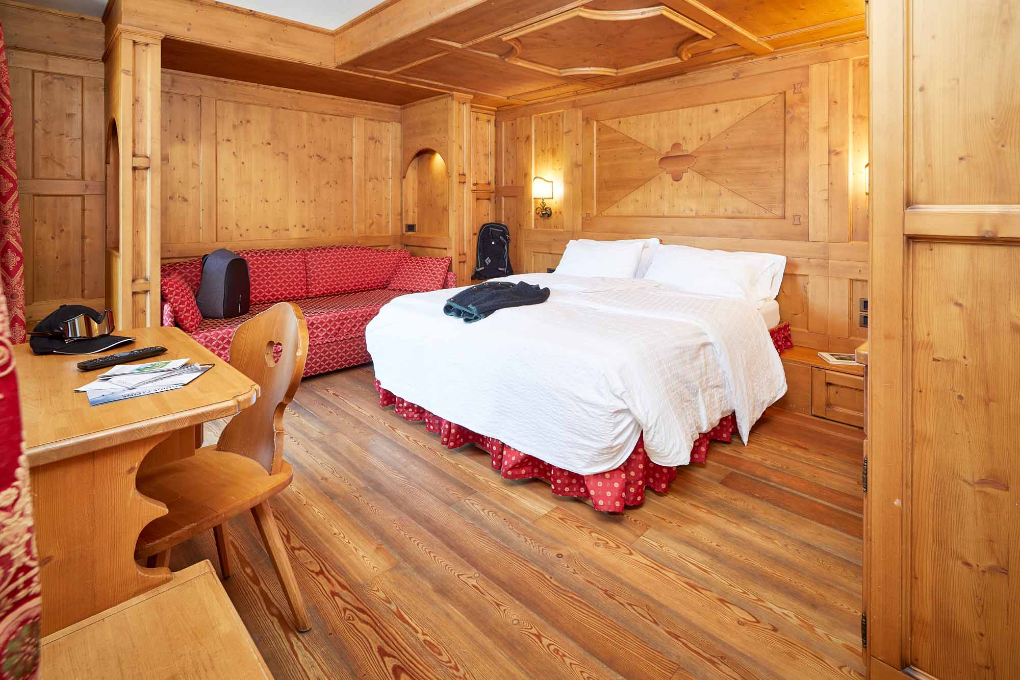 Camera Superior circa 25 mq con pavimento in legno. Arredamento in legno di abete in stile alpino. Letto matrimoniale o 2 letti separati e nicchia con divano. Se occupata da 3 o 4 persone, il divano può trasformarsi in letto singolo o letto a castello. Culla disponibile su richiesta.